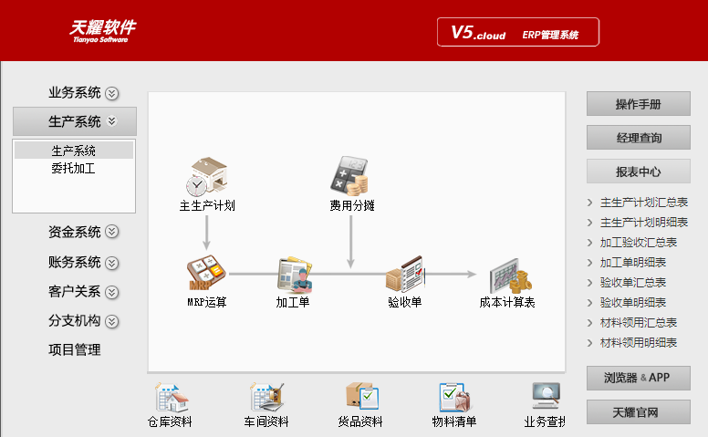 基本生产:车间资料、替代品设置、主生产计划、加工单、验收单、在制品单、审核中心、库存查询、分析报表。