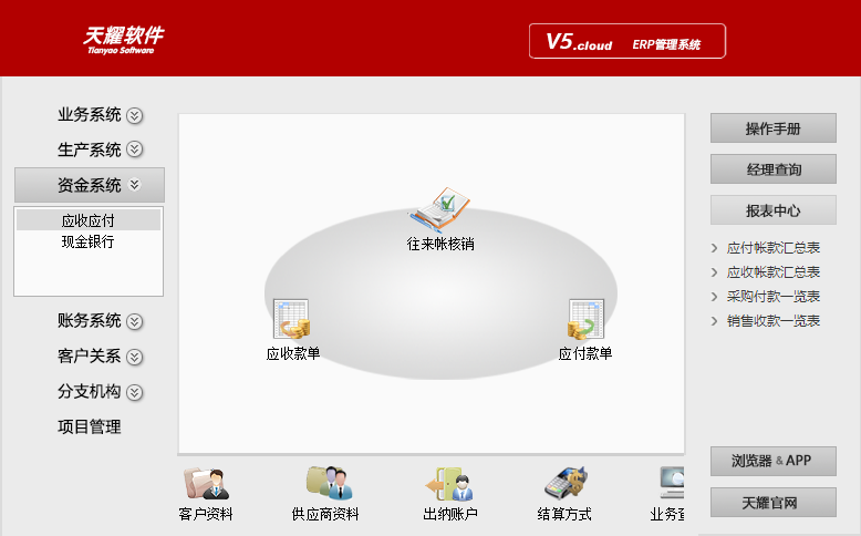 往来结算:应收款单、应付款单、审核中心、应收款初始化、应付款初始化、分析报表。