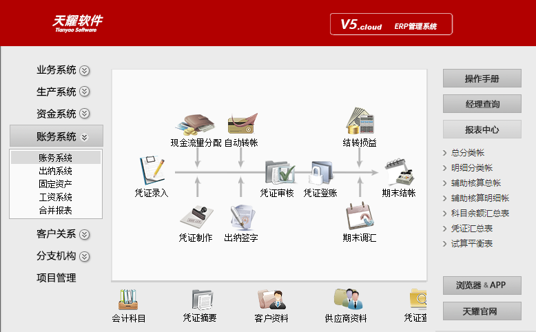 现金银行:银行存取款单、现金盘点单、出纳会计、银行对账单、余额调节表、审核中心、分析报表。
