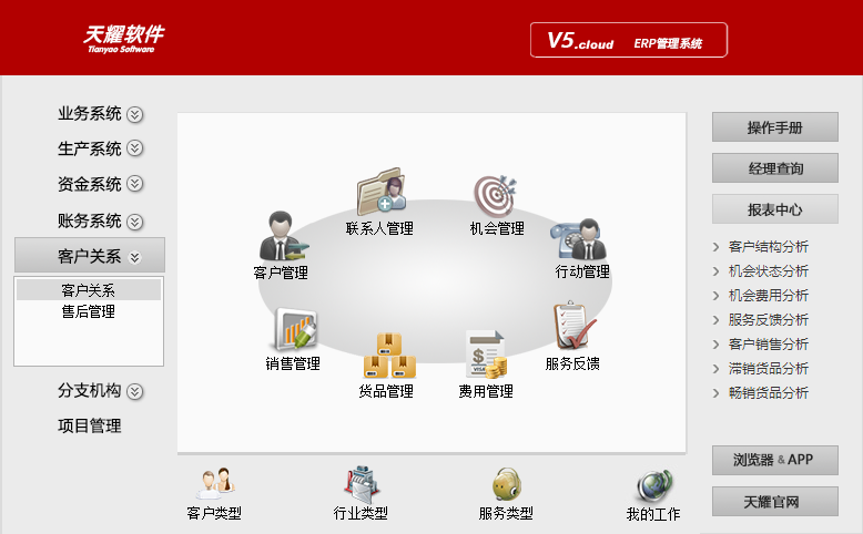 客户关系:客户管理、联系人管理、货品管理、机会管理、行动管理、费用管理、销售管理、服务反馈。