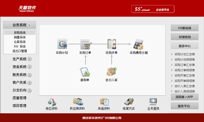 采购系统:采购计划、采购申请、采购订单、采购开单、估价入库、费用分摊、供应商管理、开票管理、审核中心。