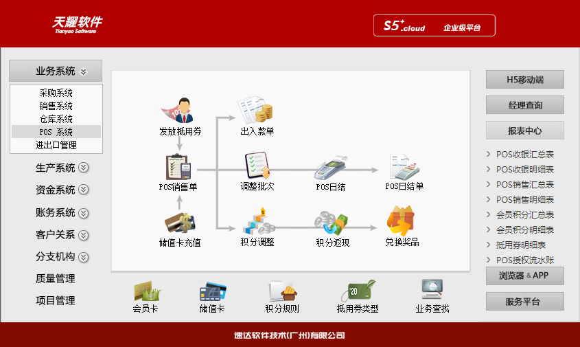 POS 管理:会员卡管理、储值卡管理、POS销售单、POS日结、POS日结单、POS出入款单、储值卡充值、时段促销价设置、POS销售批号调整、调整积分、积分返现、兑换奖品、发放抵用券、注销抵用券、分析报表。