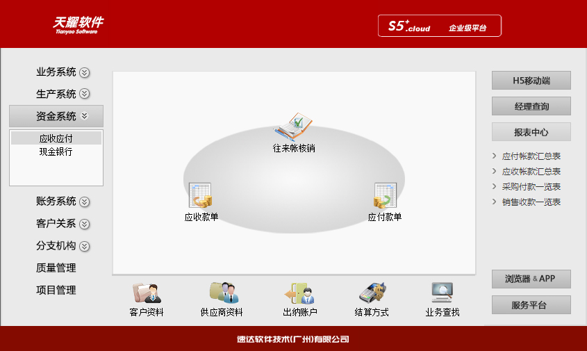 往来结算:应收款单、应付款单、审核中心、应收款初始化、应付款初始化、分析报表。