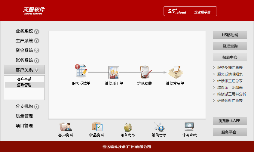 售后管理:服务反馈单、维修派工单、维修验收单、维修发货单、审核中心、分析报表。