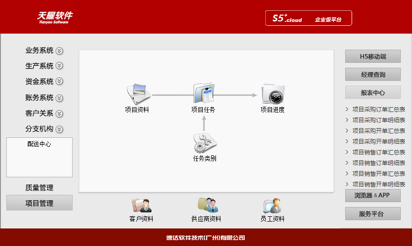 基础资料:共用资料、采购资料、销售资料、仓库资料、POS资料、总账资料、现金资料、人力资料、固定资产资料、报警信息、企业项目、企业信息。