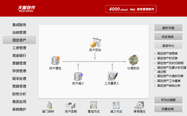 支持固定资产增加、固定资产清理、固定资产变动并生成相关会计凭证。