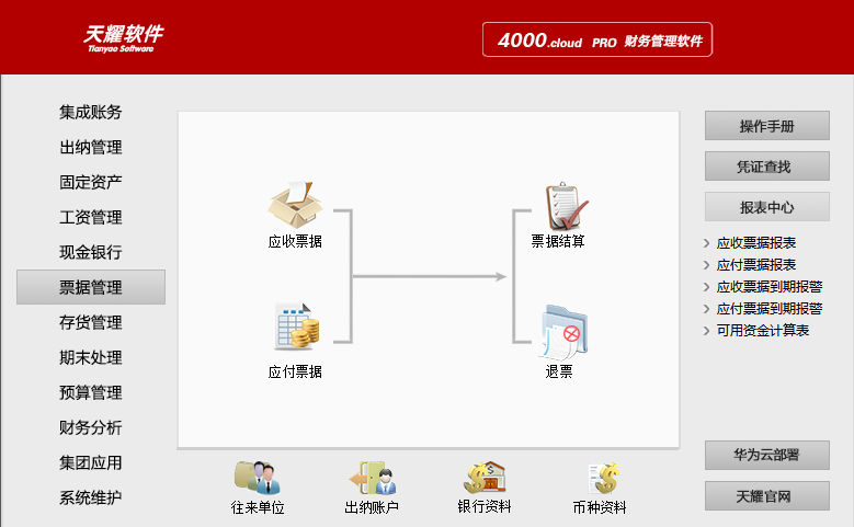 票据结算、退票是对应收/应付票据的收/付款情况进行跟踪,完善有价票据管理。