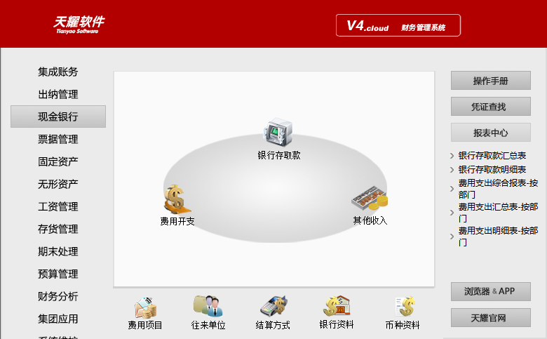 支持现金银行汇总表、现金银行明细表、费用支出综合统计表。