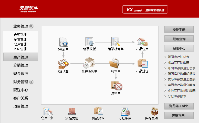 仓库管理:库存盘点、调拨、库存变动、分析报表、分析报表、领料单、退料单、产品进仓单、组装拆卸。