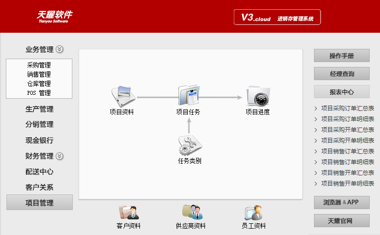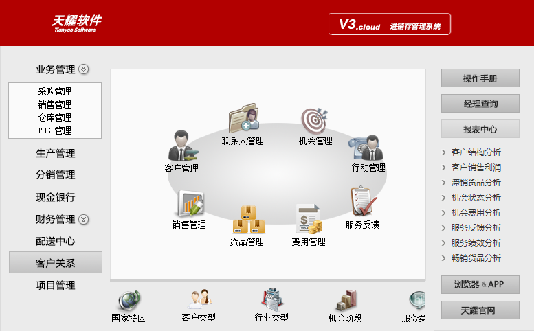 客户关系:客户管理、货品管理、机会管理、行动管理、费用管理、销售管理、服务反馈、联系人管理。