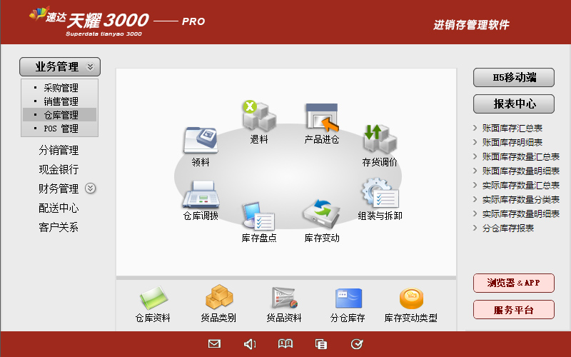 仓库管理:库存盘点、调拨、库存变动、分析报表、分析报表、领料单、退料单、产品进仓单、组装拆卸。