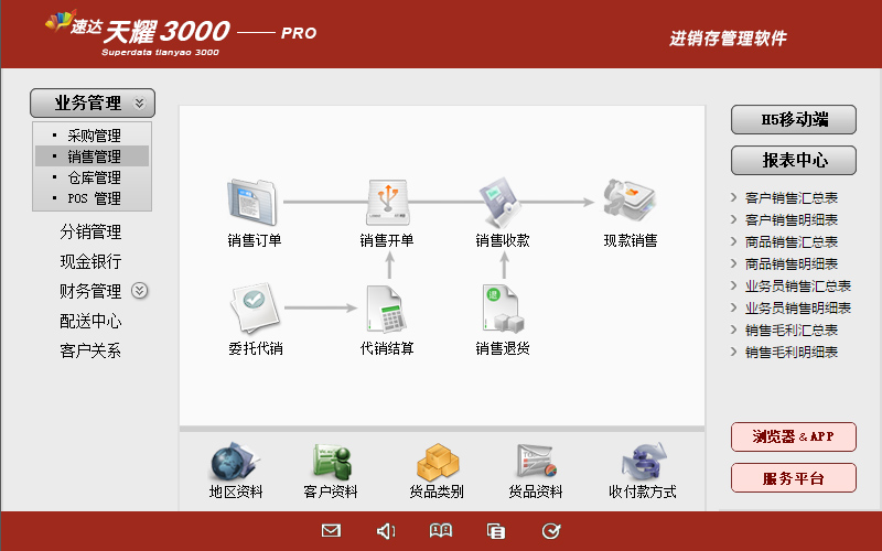 销售管理:销售订单、销售开单、现款销售、销售退货、委托代销、代销结算、开票管理、分析报表。