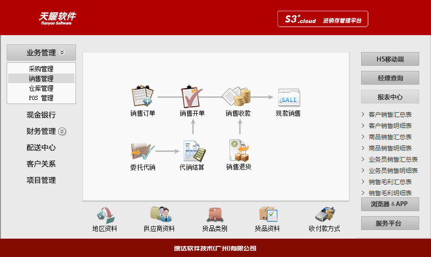 销售管理:销售订单、销售开单、现款销售、销售退货、委托代销、代销结算、开票管理、分析报表。