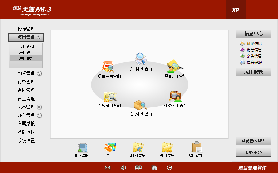 支持材料信息、费用信息、项目类型、单位类型、相关单位的录入、查询和跟踪;