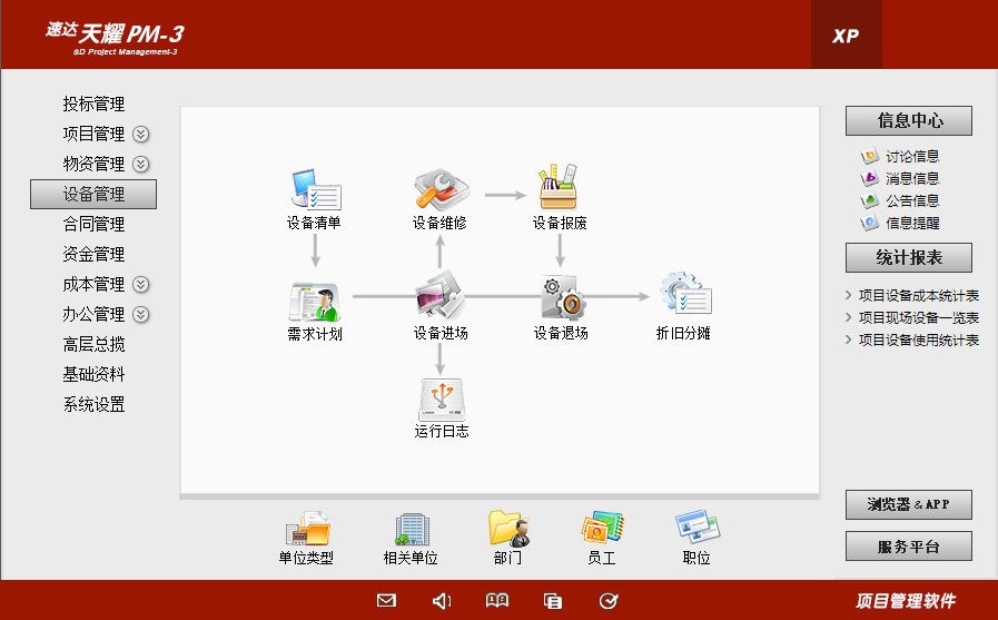 管理企业自有周转设备、项目专用设备和各种其他设备的基本概况,跟踪设备当前的使用状态;